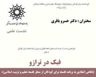 گروه فلسفه و فکرپروری برای کودکان و نوجوانان (فبک) پژوهشگاه علوم انسانی و مطالعات فرهنگی دوازدهمین نشست از سلسه نشستهای ماهانه: فعالین و مربیان برنامه فلسفه برای کودکان با عنوان «فبک در ترازو (نگاهی انتقادی به برنامه فلسفه برای کودکان از منظر فلسفه تعلیم و تربیت اسلامی)» با حضور دکتر خسرو باقری نوع پرست برگزار می کند.