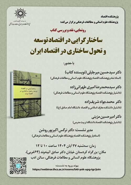 نشست رونمایی، نقد و بررسی کتاب: «ساختارگرایی در اقتصاد توسعه و تحول ساختاری در اقتصاد ایران»، به همت پژوهشکده اقتصاد در روز سه شنبه 27 آبان 1404 با حضور: دکتر سید حسین میرجلیلی (نویسنده کتاب)، و ناقدان: دکتر سید محمدرضا امیری طهرانیزاده (دانشیار پژوهشکده اقتصاد پژوهشگاه علوم انسانی و مطالعات فرهنگی)، دکتر امیر حسین مزینی (دانشیار پژوهشکده اقتصاد دانشگاه تربیت مدرس) و دکتر محمد جواد شریف زاده (دانشیار و رییس دانشکده معارف اسلامی و اقتصاد دانشگاه امام صادق (ع)) و همچنین دکتر نرگس اکبرپور روشن (استادیار پژوهشکده اقتصاد پژوهشگاه علوم انسانی و مطالعات فرهنگی و مدیر نشست) در پژوهشگاه علوم انسانی و مطالعات فرهنگی برگزار شد.