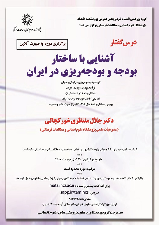 دوره آموزشی «درسگفتار آشنایی با ساختار بودجه و بودجهریزی در ایران» با همکاری پژوهشکده اقتصاد پژوهشگاه علوم انسانی و مطالعات فرهنگی در تاریخ 30 شهریور ماه 1400 بصورت مجازی برگزار میشود.