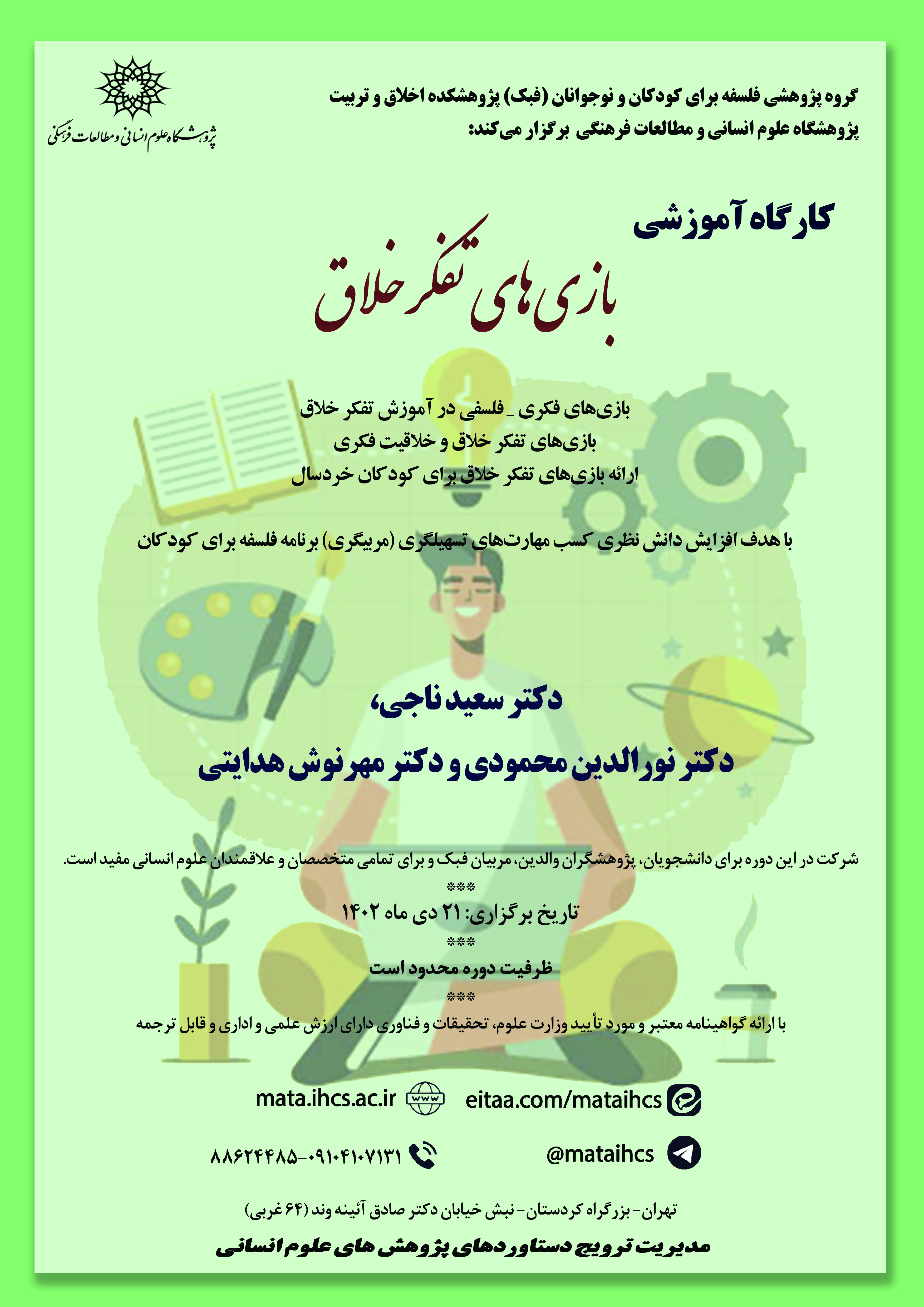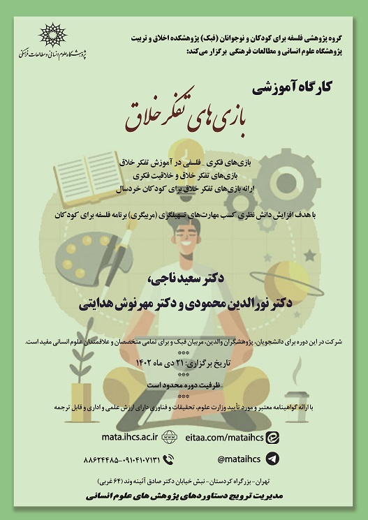دوره آموزشی «کارگاه بازیهای تفکرخلاق» توسط گروه پژوهشی فلسفه برای کودکان و نوجوانان (فبک) پژوهشکده اخلاق و تربیت پژوهشگاه علوم انسانی و مطالعات فرهنگی از تاریخ 21دی ماه 1402 بصورت حضوری برگزار میشود.