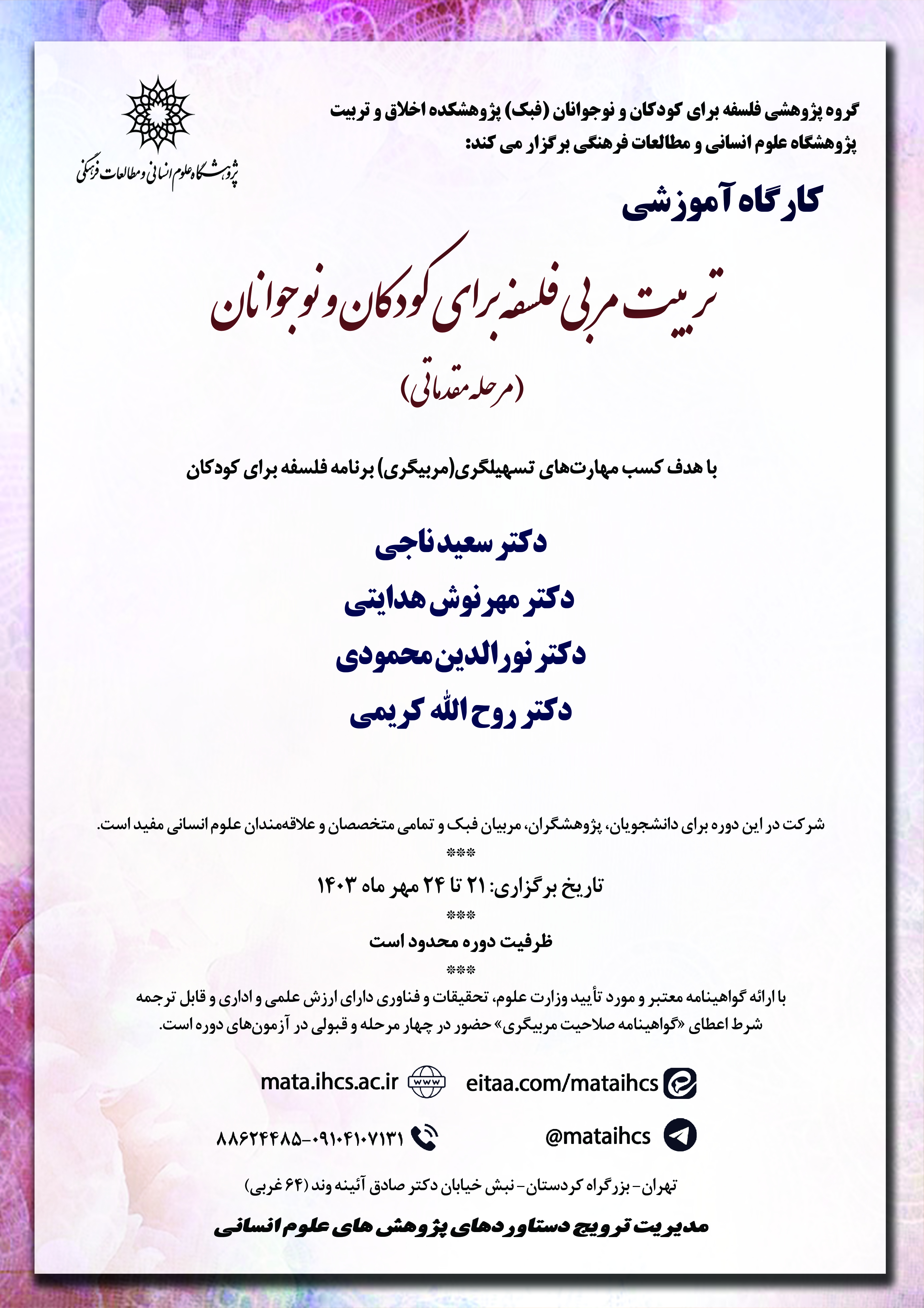 دوره آموزشی «کارگاه تربیت مربی فلسفه برای کودکان و نوجوانان (مرحله مقدماتی)» توسط گروه پژوهشی فلسفه برای کودکان و نوجوانان (فبک) پژوهشکده اخلاق و تربیت پژوهشگاه علوم انسانی و مطالعات فرهنگی در تاریخ 21 الی 24 مهرماه 1403بصورت حضوری برگزار میشود.