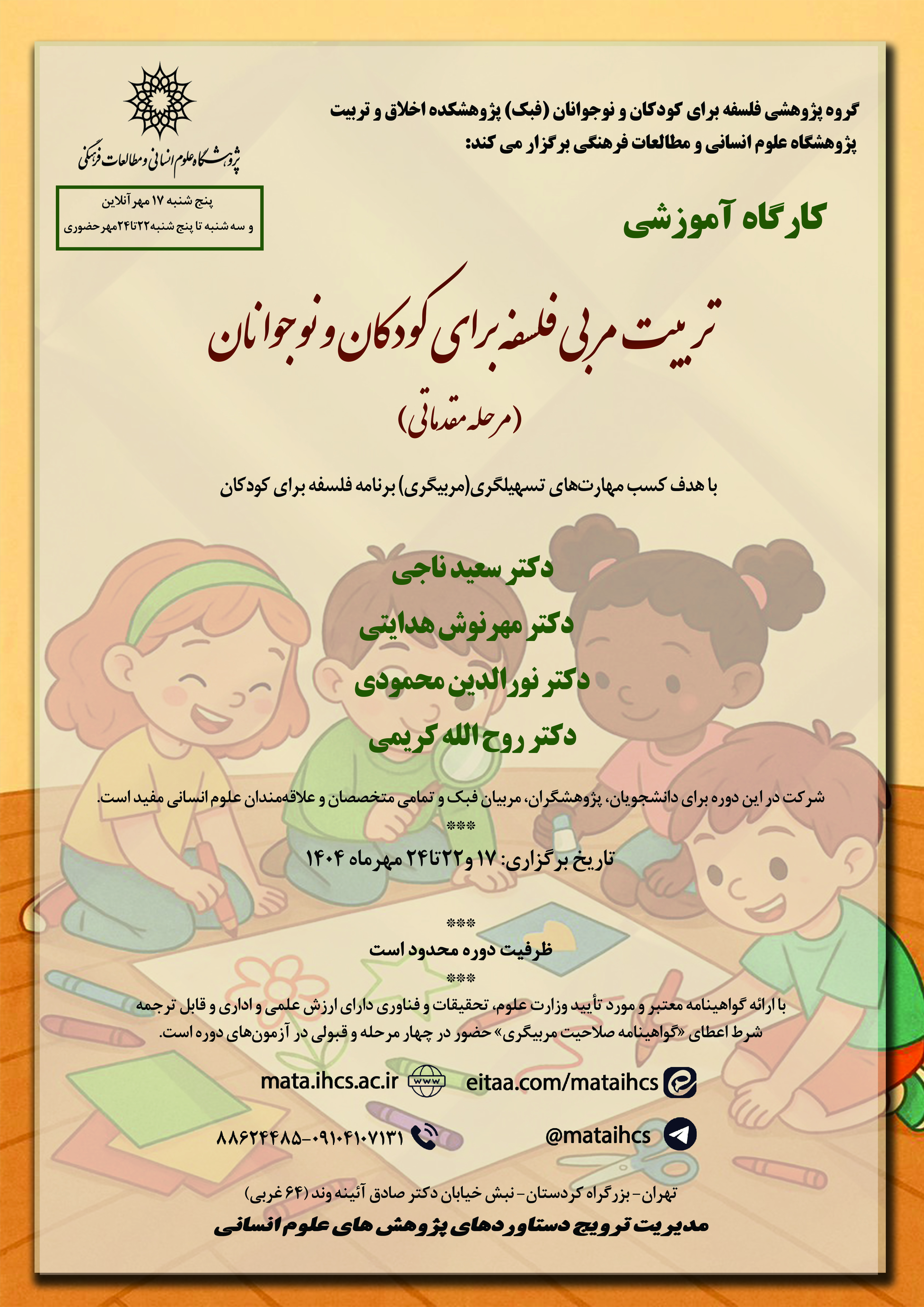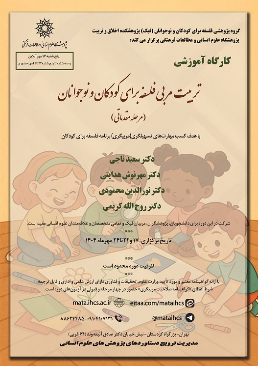 دوره آموزشی «کارگاه تربیت مربی فلسفه برای کودکان و نوجوانان (مرحله مقدماتی)» توسط گروه پژوهشی فلسفه برای کودکان و نوجوانان (فبک) پژوهشکده اخلاق و تربیت پژوهشگاه علوم انسانی و مطالعات فرهنگی در تاریخ 17و22تا24 مهرماه1404 بصورت حضوری و مجازی برگزار میشود.