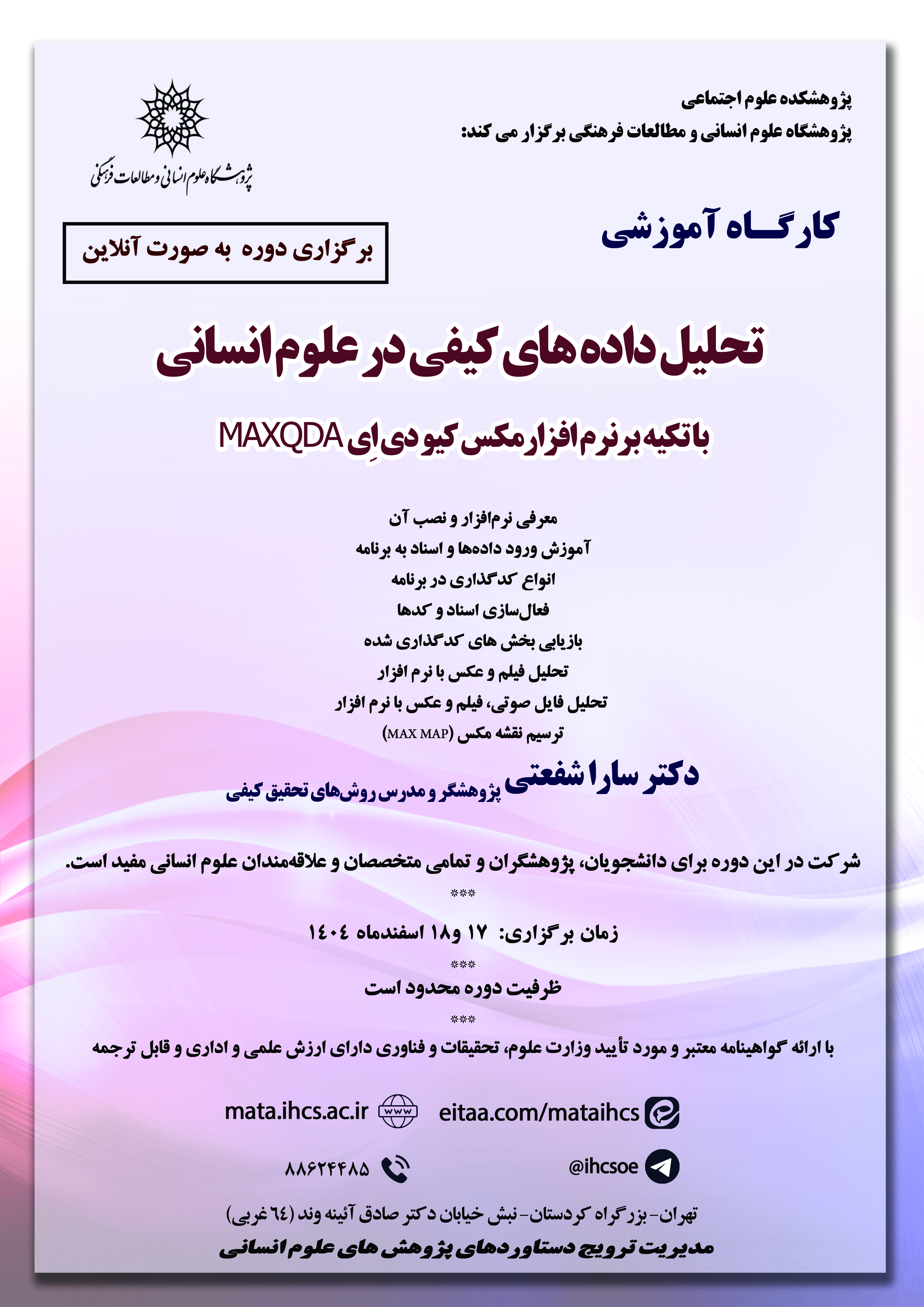 دوره آموزشی «کارگاه آشنایی با نرم افزار تحلیل داده های کیفی مکس کیو دی اِی MAXQDA» توسط مدیریت ترویج دستاوردهای پژوهش های علوم انسانی پژوهشگاه علوم انسانی و مطالعات فرهنگی در تاریخ 17و18 اسفندماه 1404 بصورت مجازی برگزار میشود.