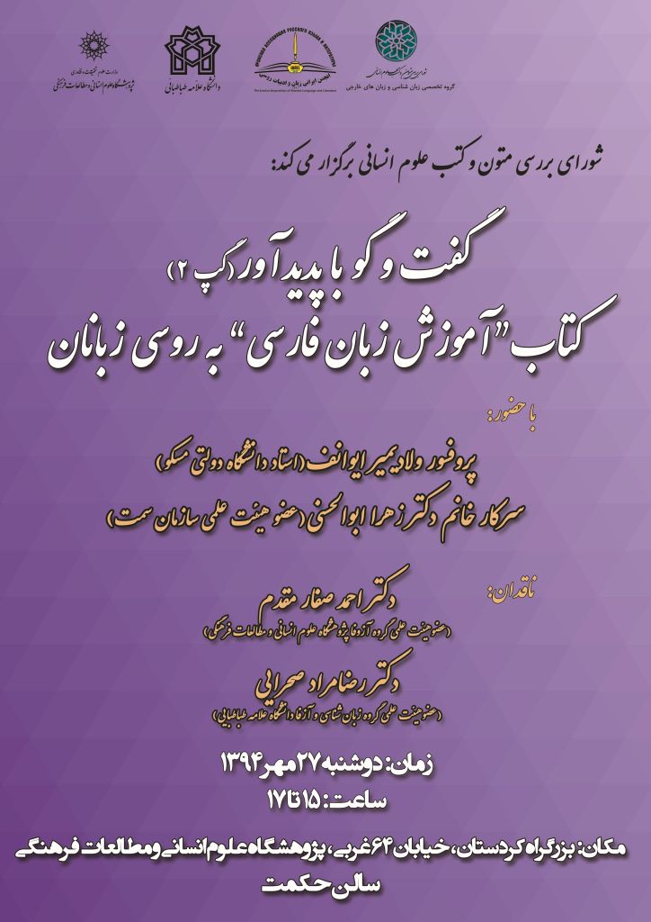گروه تخصصی زبانشناسی و زبان های خارجه شورای بررسی متون و کتب علوم انسانی پژوهشگاه علوم انسانی و مطالعات فرهنگی نشستی با عنوان «گفت و گو با پدیدآور (گپ2) (کتاب آموزش زبان فارسی به روسی زبانان)» برگزار می کند.