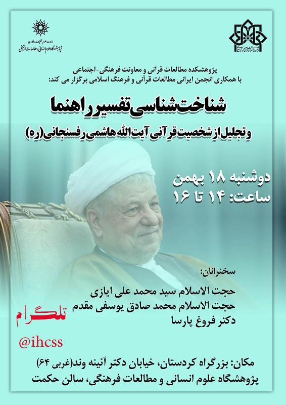 پژوهشکده مطالعات قرآنی و معاونت فرهنگی اجتماعی با همکاری انجمن ایرانی مطالعات قرآنی و فرهنگ اسلامی مراسم تجلیل از شخصیت قرآنی آیت الله هاشمی رفسنجانی (ره) با عنوان شناخت شناسی تفسیر راهنما و در روز دوشنبه ۱۸ بهمن از ساعت ۱۴ الی ۱۶ برگزار می کند.
