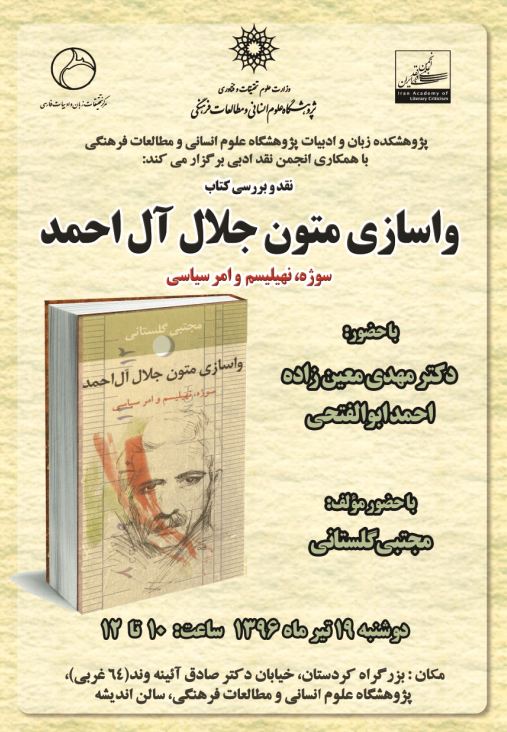 پژوهشکده زبان و ادبیات با همکاری انجمن نقد ادبی جلسه نقد و بررسی کتاب «واسازی متون جلال آل احمد» (سوژه نهیلیسم و امر سیاسی) با حضور دکتر مهدی معین زاده و احمد ابوالفتحی و با حضور مؤلف کتاب مجتبی گلستانی برگزار می کند.
