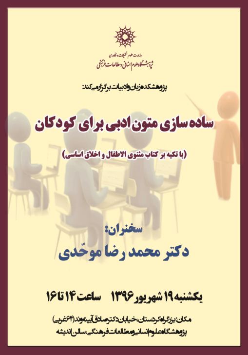پژوهشکده زبان و ادبیات نشستی با عنوان «ساده سازی متون ادبی برای کودکان» (با تکیه بر کتاب مثنوی الاطفال و اخلاق اساسی) با سخنرانی دکتر محمدرضا موحدی برگزار می کند.