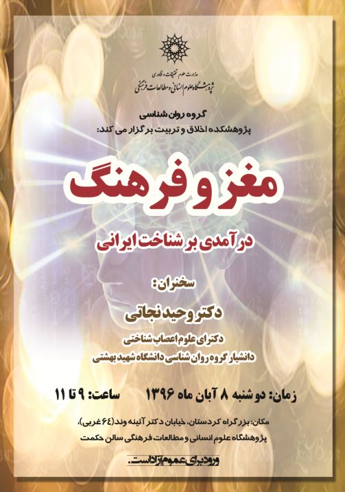 گروه روانشناسی پژوهشکده اخلاق و تربیت نشستی با عنوان «مغز و فرهنگ» درآمدی بر شناخت ایرانی، با سخنرانی دکتر وحید نجاتی (دکترای علوم اعصاب شناختی و دانشیار گروه روانشناسی دانشگاه شهید بهشتی) برگزار می کند.