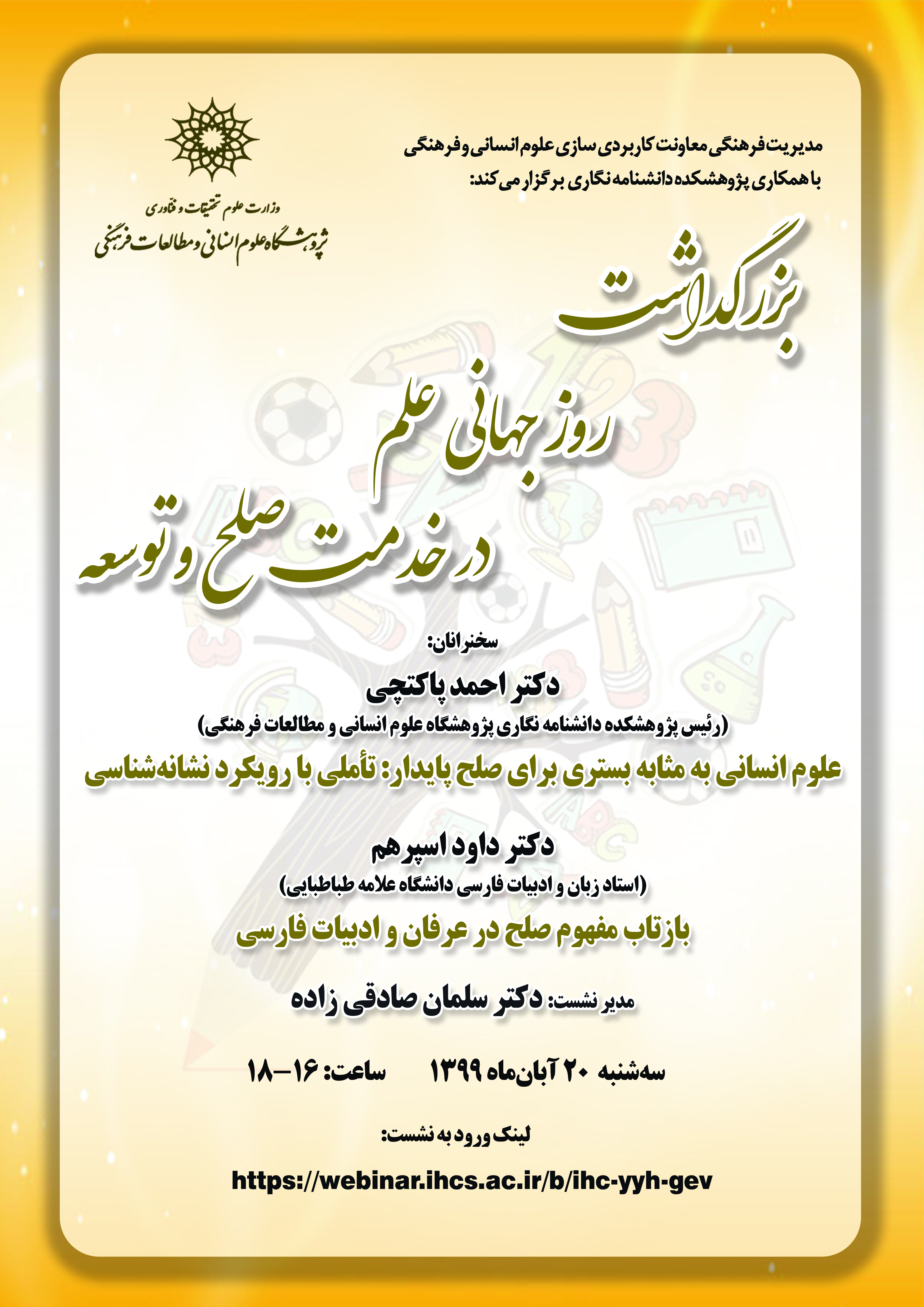 به‌مناسبت روز جهانی علم در خدمت صلح و توسعه، مدیریت فرهنگی پژوهشگاه با همکاری پژوهشکده‌ی دانشنامه‌نگاری پژوهشگاه، نشستی علمی تخصصی با موضوع «علوم انسانی به‌مثابه بستری برای صلح پایدار: تأملی با رویکرد نشانه‌شناسی» در روز 27 آبان 1399، از طریق فضای مجازی و با حضور علاقه‌مندان برگزار کرد.