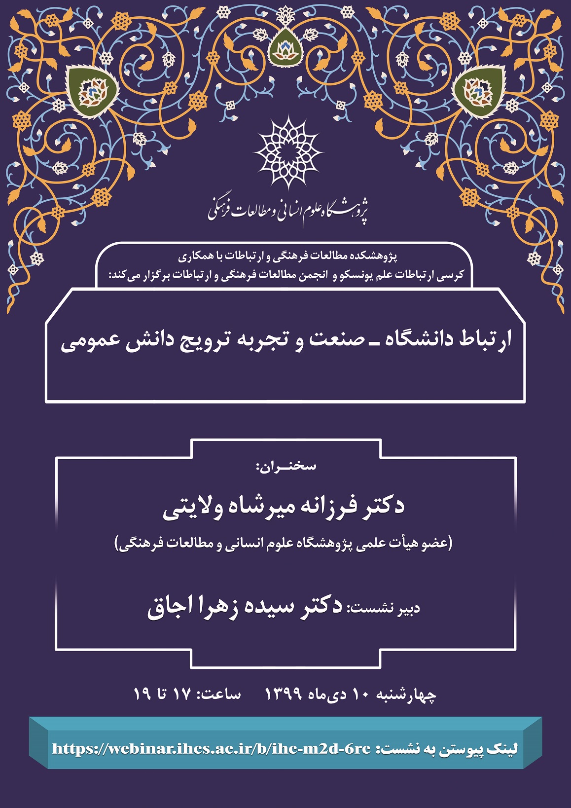 پژوهشکدهی مطالعات فرهنگی و ارتباطات با همکاری کرسی ارتباطات علم یونسکو و انجمن مطالعات فرهنگی و ارتباطات نشست مجازی «ارتباط دانشگاه-صنعت و تجربهی ترویج دانش عمومی» را در تاریخ 10 دی ماه 1399 برگزار کرد. در این وبینار ابتدا دبیر نشست، سیدهزهرا اجاق گفت: اهمیت اقتصاد دانشبنیان در جهان امروز بر هیچ کس پوشیده نیست و در این فضا، دانشگاهها و نهادهای آکادمیک ناچار به نقشآفرینی جدیدی هستند ضمن اینکه، تأکید بر مأموریت سوم آکادمی که از آن به عنوان ارتباطات/ ترویج یا عمومیسازی علم یاد می شود، مسیر این تحول را نشان میدهد که عبارت است از؛ ارتباط دانشگاهها و پژوهشگاهها با صنعت و جامعه. دکتر اجاق ادامه داد: در مهر 1398 نیز وزیر علوم از «طرح تحول همکاریهای دانشگاه و مؤسسات پژوهشی و فناوری با جامعه و صنعت» رونمایی کرد که بر لزوم چنین تغییراتی ناظر بود. این نشست با حضور دکتر فرزانه میرشاهولایتی، استادیار پژوهشکده مدیریت و اقتصاد پژوهشگاه بر این موضوع تمرکز دارد.