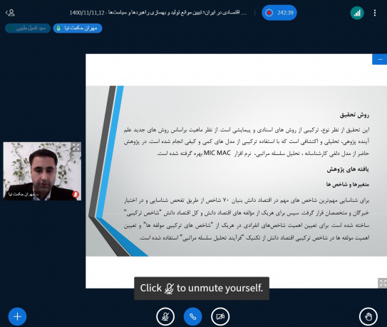 دومین نشست همایش ملی «بازشناسی چالشهای رشد اقتصادی در ایران؛ تبیین موانع تولید و بهسازی راهبردها و سیاستها»، به همت پژوهشکده اقتصاد، ۱۱ بهمنماه ۱۴۰۰، با دبیری دکتر سیدکمیل طیبی؛ استاد دانشگاه اصفهان،گروه اقتصاد دانشکده علوم اداری و اقتصاد، مطابق جدول زیر بهصورت مجازی برگزار شد.