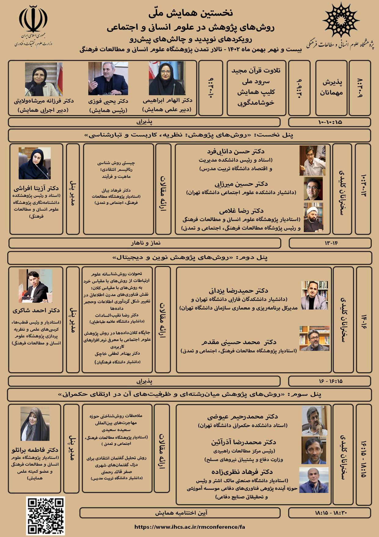 نخستین همایش ملّی «روشهای پژوهش در علوم انسانی و اجتماعی: رویکردهای نوپدید و چالشهای پیشِرو» روز یکشنبه، 29 بهمن ماه 1402 به همّت گروه پژوهشی مدیریت پژوهشگاه علوم انسانی و مطالعات فرهنگی در محل تالارِ تمدنِ پژوهشگاه برگزار میشود.