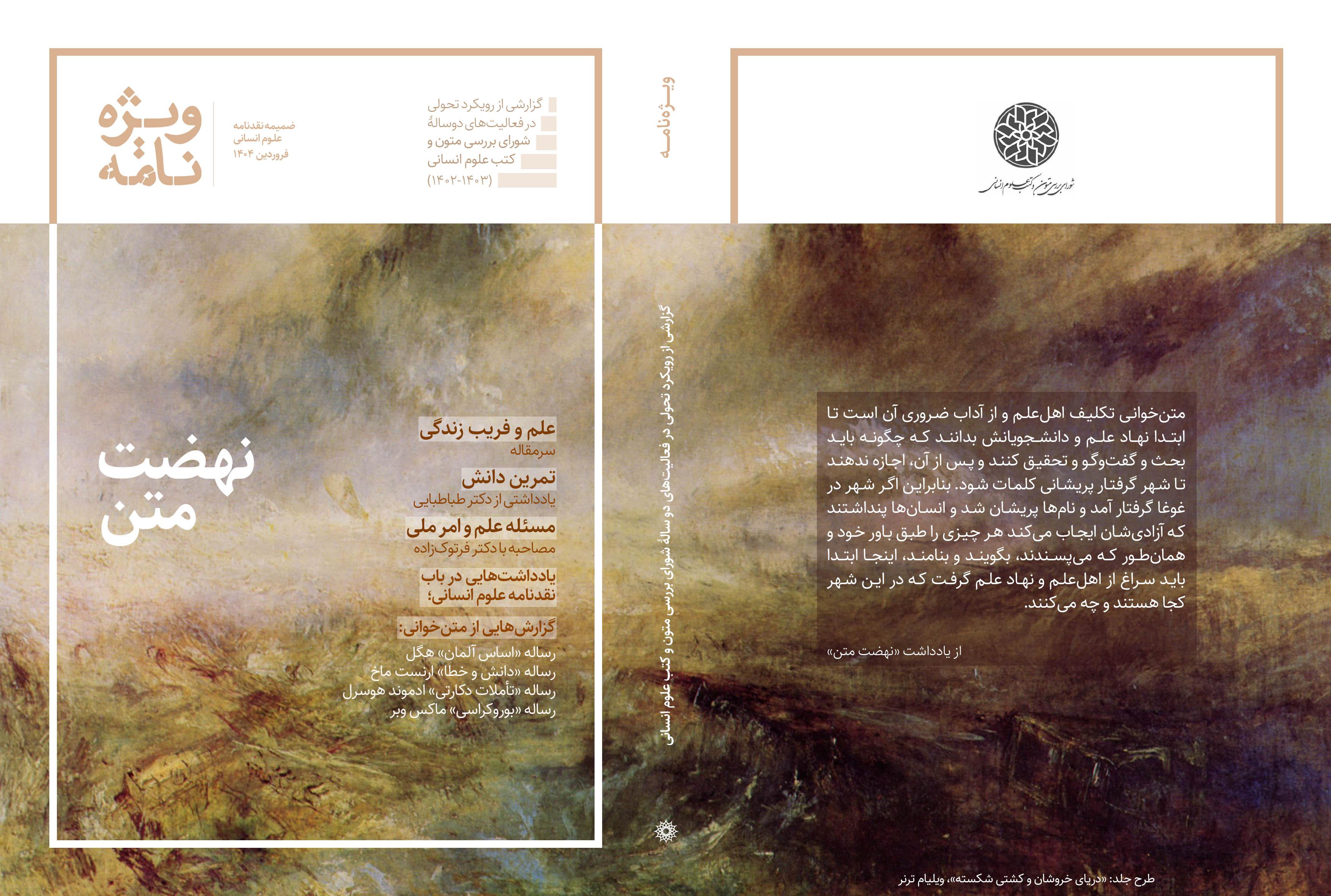 در بخش اول ویژهنامه، علاوه بر سرمقالهای از دکتر حسن نیلی با عنوان علم و فریب زندگی و دو یادداشت از دکتر محمدتقی طباطبایی رئیس گروه فلسفه با موضوع نقد بهسان پرورش برای دانش و دکتر اباصالح تقیزاده طبری دبیر گروه علوم سیاسی با عنوان متنخوانی چیست؟ ، مصاحبهای داشتهایم با دکتر حمیدرضا فرتوکزاده رئیس گروه مدیریت شورای بررسی متون و کتب علوم انسانی با عنوان علوم انسانی و امر ملی .در ادامه گزارشی علمی آمده است از نشستی با حضور دکتر طباطبایی درباره ضرورت مراجعه به «متنهای کلاسیک فلسفی» و گزارشی از تغییر در ساختار و رویههای «پژوهشنامه انتقای متون و برنامههای علوم انسانی».