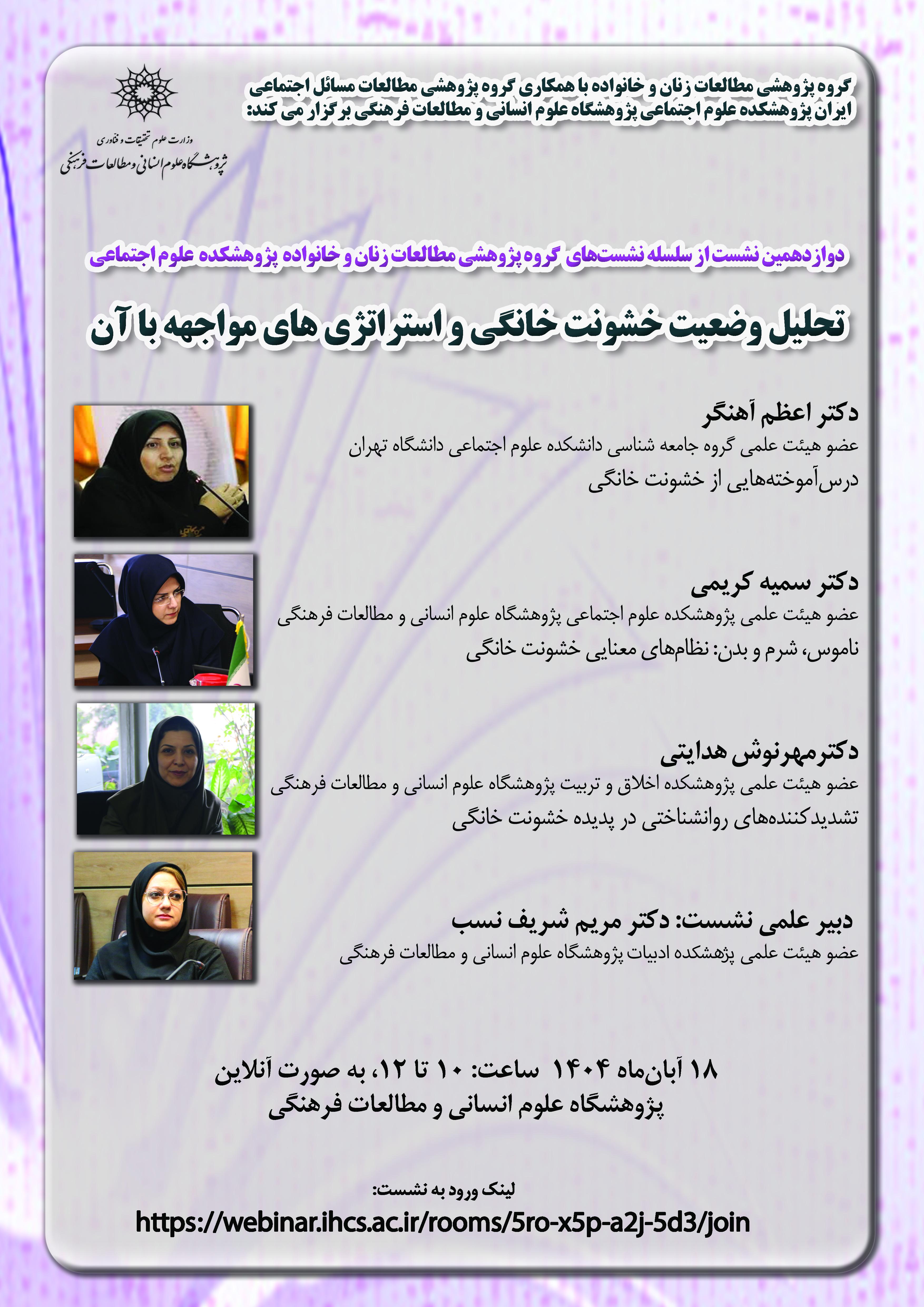 گروه پژوهشی مطالعات زنان و خانواده پژوهشکده علوم اجتماعیِ پژوهشگاه علوم انسانی و مطالعات فرهنگی نشستی با شرح و عنوان زیر برگزار میکند: