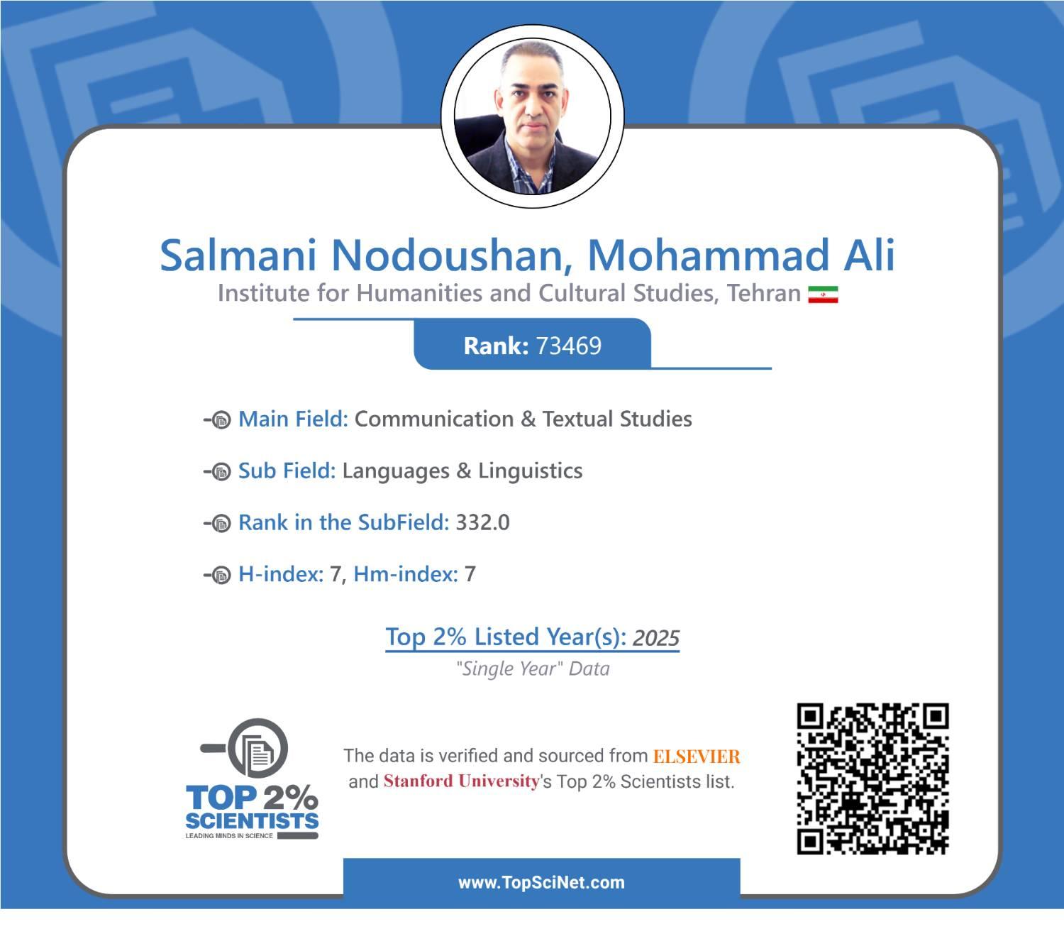 دکتر محمدعلی سلمانی ندوشن، عضو هیئت علمی پژوهشگاه علوم انسانی و مطالعات فرهنگی از سوی دانشگاه استنفورد آمریکا در لیست «دو درصد دانشمندان برتر جهان» قرار گرفت. دانشگاه استنفورد آمریکا با همکاری مؤسسه الزویر هر ساله علاوه بر رتبهبندی دانشگاهها و مؤسسات پژوهشی، به رتبهبندی برجستهترین دانشمندان جهان نیز اقدام میکند و اسامی دانشمندانی که در دو درصد بالای قرار میگیرند را در پایگاه «تاپساینت دات کام» (https://topscinet.com) منتشر میکند.