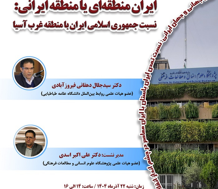 نشست «ایران منطقهای یا منطقه ایرانی: نسبت جمهوری اسلامی ایران با منطقه غرب آسیا» به همت پژوهشکده مطالعات سیاسی و روابط بینالملل و حقوق پژوهشگاه علوم انسانی و مطالعات فرهنگی در هفته پژوهش با سخنرانی دکتر سیدجلال دهقانی فیروزآبادی (استاد روابط بینالملل دانشگاه علامه طباطبایی) 22 آذرماه 1404 برگزار شد.