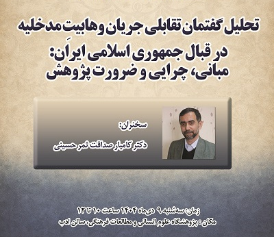 نشست علمی «تحلیل گفتمان تقابلی جریان وهابیت مدخلیه در قبال جمهوری اسلامی ایران»، ۹ دیماه ۱۴۰۴، در پژوهشگاه علوم انسانی و مطالعات فرهنگی برگزار شد. سخنران این نشست که توسط پژوهشکده مطالعات سیاسی، بینالمللی و حقوقی برگزار شد، دکتر کامیار صداقتثمرحسینی بود.