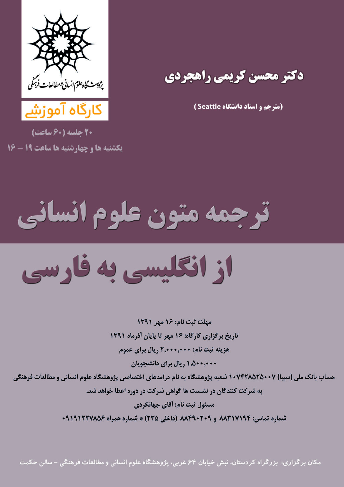 کارگاه ترجمه متون علوم انسانی از انگلیسی به فارسی با تدریس دکتر محسن کریمی راهجردی مترجم و استاد دانشگاه Seattle در 20 جلسه و به مدت 60 ساعت برگزار می شود.مهلت ثبت نام در این کلاس ها 15 مهر است و کلاس ها نیز از شانزدهم مهر تا پایان آذر روزهای یک شنبه و چهارشنبه هر هفته از ساعت 19 تا 16 برگزار خواهد شد.