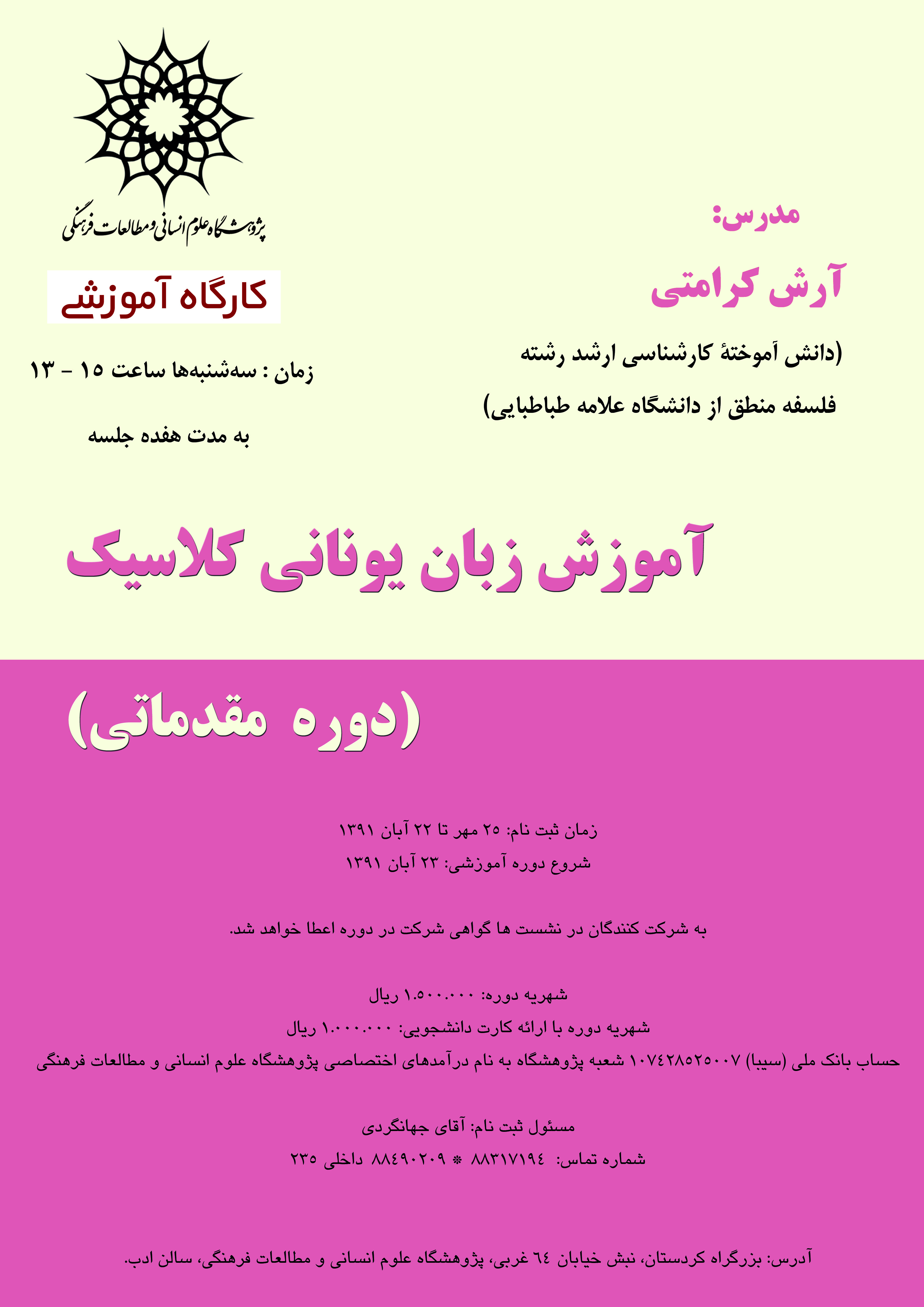 دوره آموزش زبان یونانی کلاسیک هم از 23 آبان شروع شده و سهشنبهها از ساعت 15 تا 13 و به مدت هفده جلسه برگزار خواهد شد. شهریه دوره برای عموم 1.500000 ریال و برای دانشجویان 1.000.000 ریال است. 22 آبان آخرین مهلت ثبت نام در این دوره ها اعلام شده. علاقه مندان باید شهریه هر کدام از دوره ها را به صورت جداگانه به حساب بانک ملی (سیبا) 107428525007 شعبه پژوهشگاه به نام درآمدهای اختصاصی پژوهشگاه علوم انسانی و مطالعات فرهنگی واریز کنند .