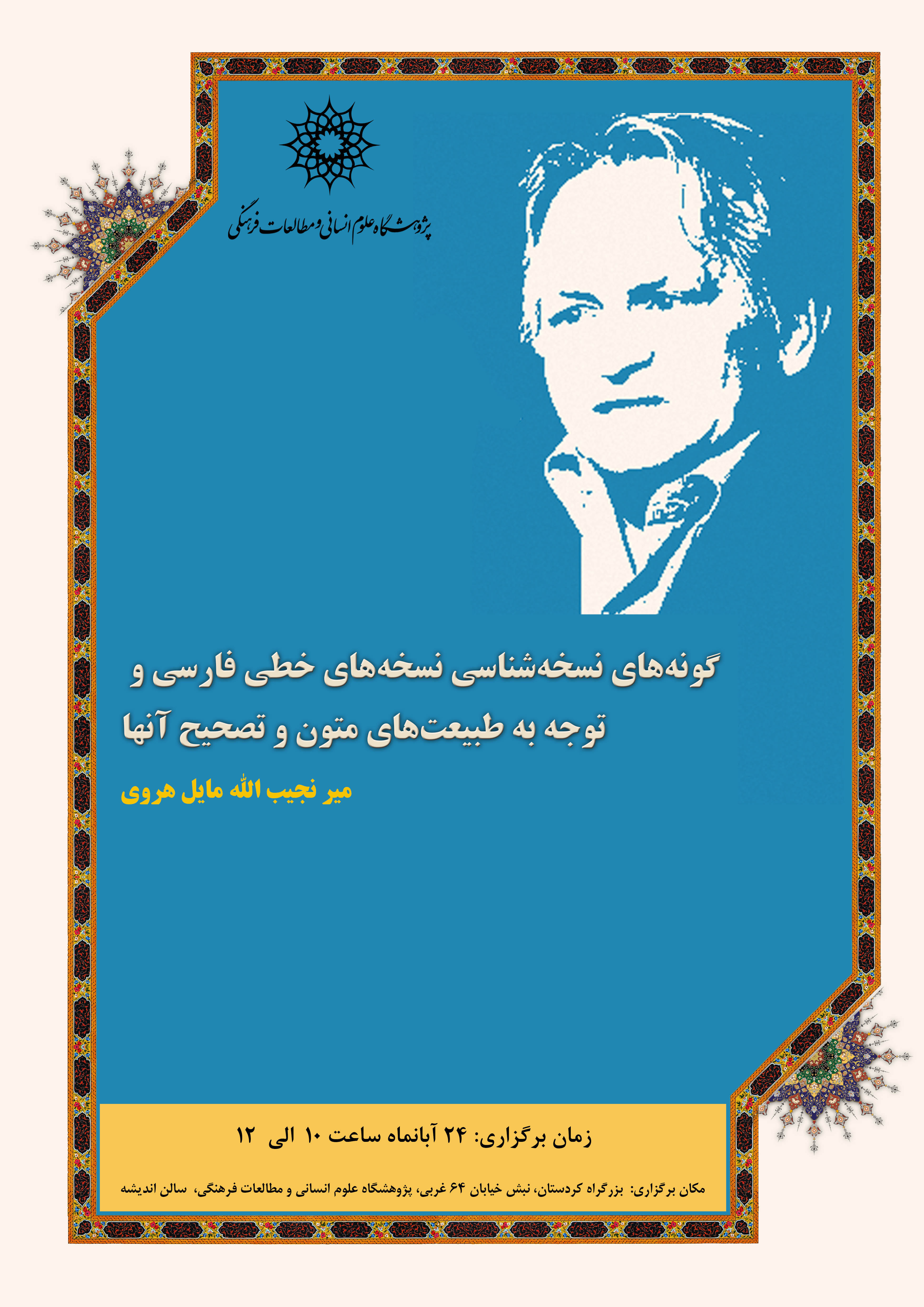 پژوهشکده ادبیات نشست علمی با عنوان «گونه‌های نسخه شناسی نسخه‌های خطی فارسی و توجه به طبیعت متون و تصحیح آن» برگزار می‌کند. سخنران این نشست میر نجیب الله مایل هروی خواهند بود.