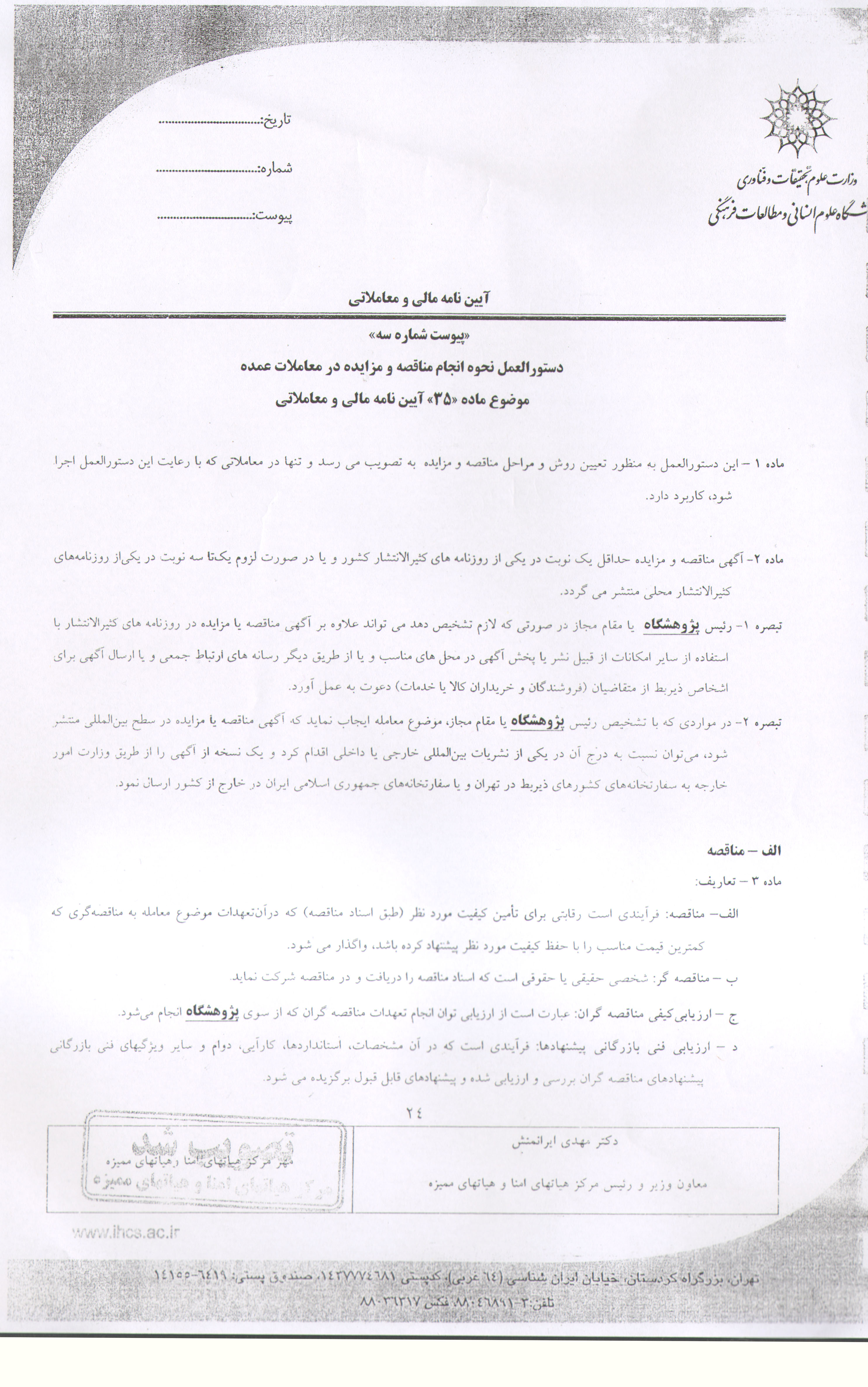 پیرو شرایط آگهی منتشره در روزنامه اطلاعات مورخ 93/11/18 از شرکت کنندگان تقاضا میشود ضمن رعایت شرایط مقرر در مناقصه واگذاری خدمات مربوط به سیستم تاسیسات سرمایش و گرمایش پژوهشگاه علوم انسانی و مطالعات فرهنگی در سال 1394 شرکت نموده و برابر اسناد و مدارک، قیمت پیشنهادی خود را از تاریخ 93/11/18 الی 93/11/25 اعلام فرمایید. ضمناً روز بازگشایی پاکتها سه شنبه 93/11/28 راس ساعت 15 بعدازظهر در دفتر معاونت اداری، مالی و مدیریت منابع پژوهشگاه خواهد بود.