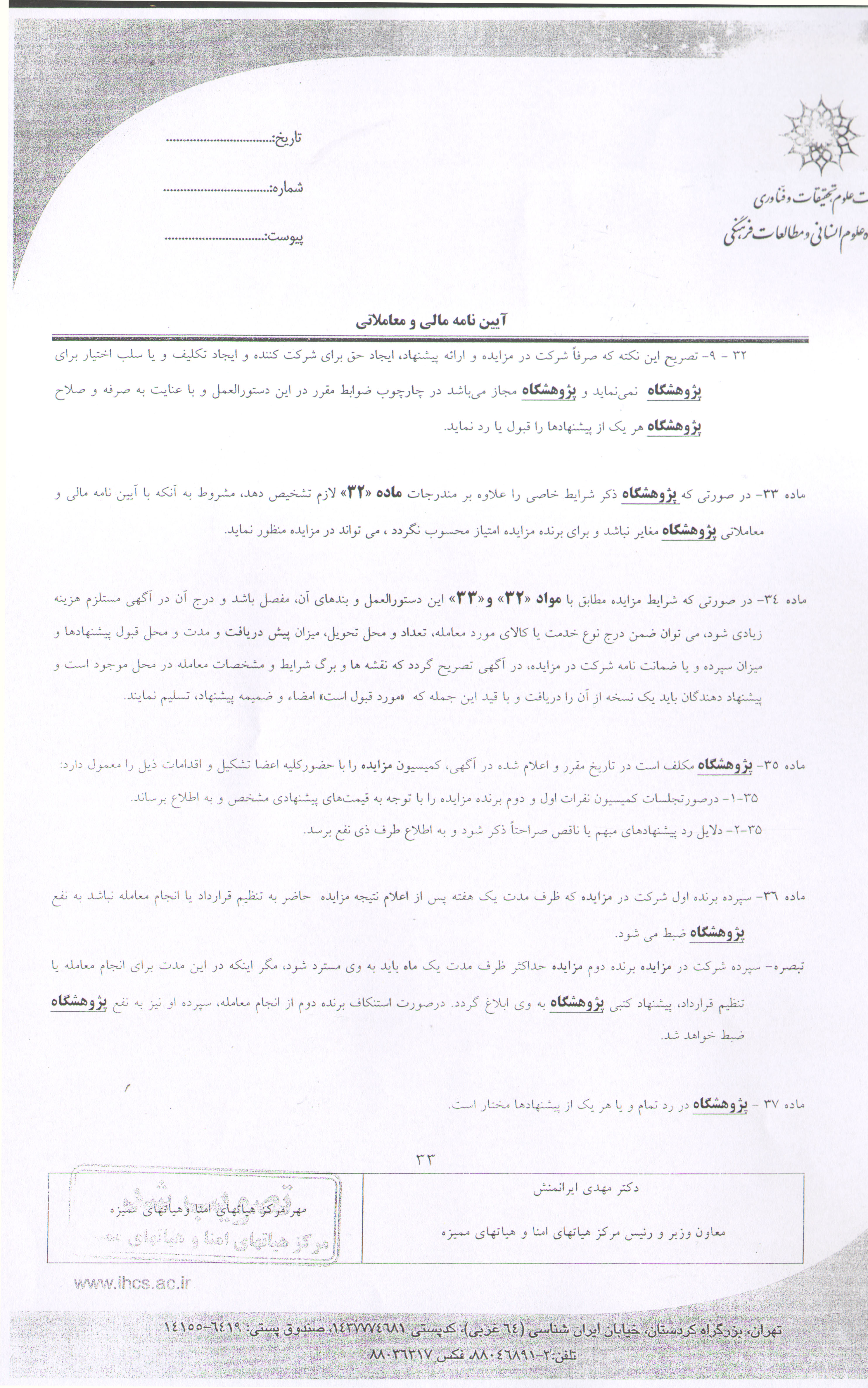 14ـ سپرده برنده اول مناقصه که ظرف مدت یک هفته از اعلام نتیجه مناقصه حاضر به تسلیم تضمین انجام تعهدات و تنظیم قرارداد یا انجام معامله نباشد، به نفع پژوهشگاه ضبط میشود.