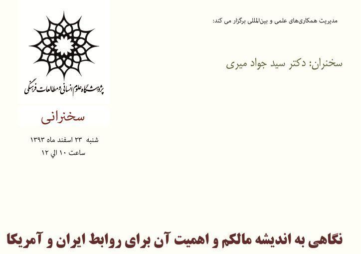 مدیریت همکاری های علمی و بین المللی پژوهشگاه علوم انسانی و مطالعات فرهنگی سخنرانی با عنوان نگاهی به اندیشه مالکم و اهمیت آن برای روابط ایران و آمریکا با سخنرانی دکتر سید جواد میری برگزار می کند.