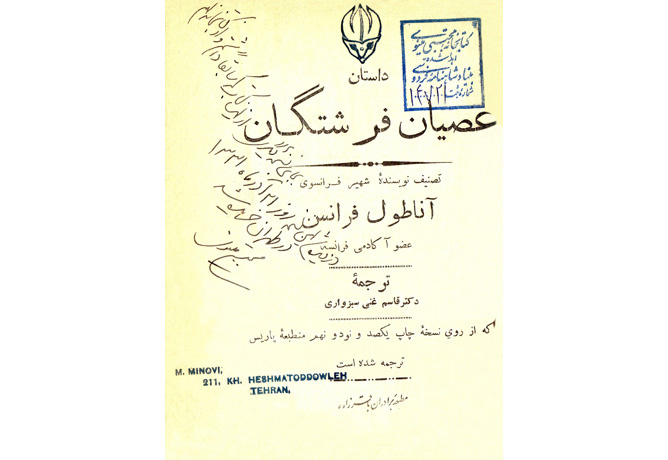 روز ۲۹ اسفند ماه ۱۳۲۹ بجای نسخه دیگری از همین چاپ که از کتابخانه ام زده بودند خریدمش، مجتبی مینوی.