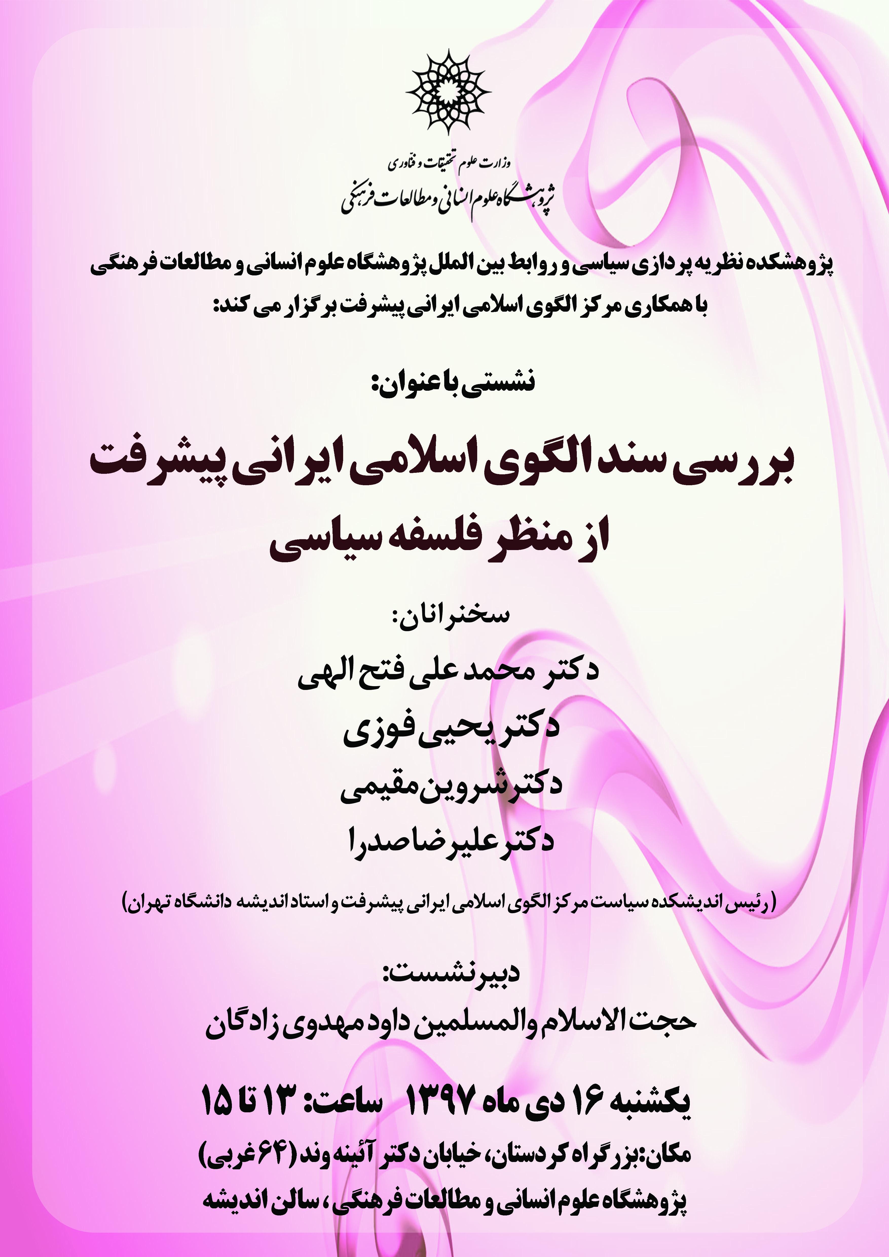چکیده موضوع سخنرانی: همانطور که می دانید پیش نویس سند الگوی اسلامی ایرانی پیشرفت از سوی مقام معظم رهبری به مطالعه و نقد آن توسط مراکز و محافل علمی توصیه شده است. لذا پژوهشکده نظریه پردازی سیاسی و روابط بین الملل در راستای فرمایش معظم له در نظر دارد این سند را از منظر فلسفه سیاسی با حضور سه تن از اساتید محترم مورد ارزیابی و نقد قرار دهد .