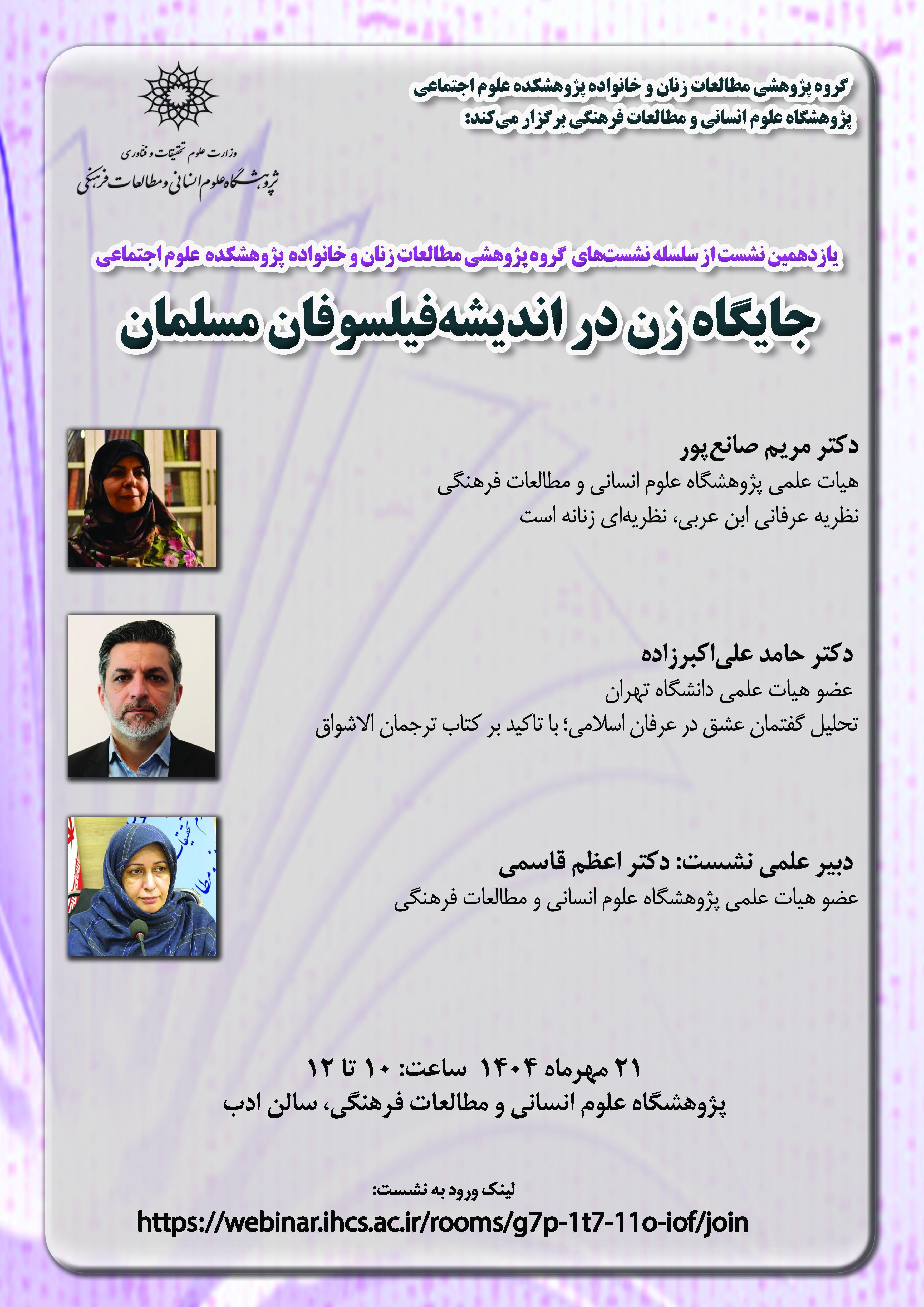 گروه پژوهشی مطالعات زنان و خانواده پژوهشکده مطالعات اجتماعیِ پژوهشگاه علوم انسانی و مطالعات فرهنگی، نشست تخصصی با عنوان :«جایگاه زن در اندیشه فیلسوفان مسلمان» با حضور استادان محترم، سرکار خانم دکترمریم صانع پور، جناب آقای دکترحامد علی اکبرزاده را از ساعت 10 تا 12 روز دوشنبه مورخ 21مهرماه 1404، در محل سالن ادب، برگزار می نماید. دبیری علمی این نشست را دکتر اعظم قاسمی بر عهده دارند.